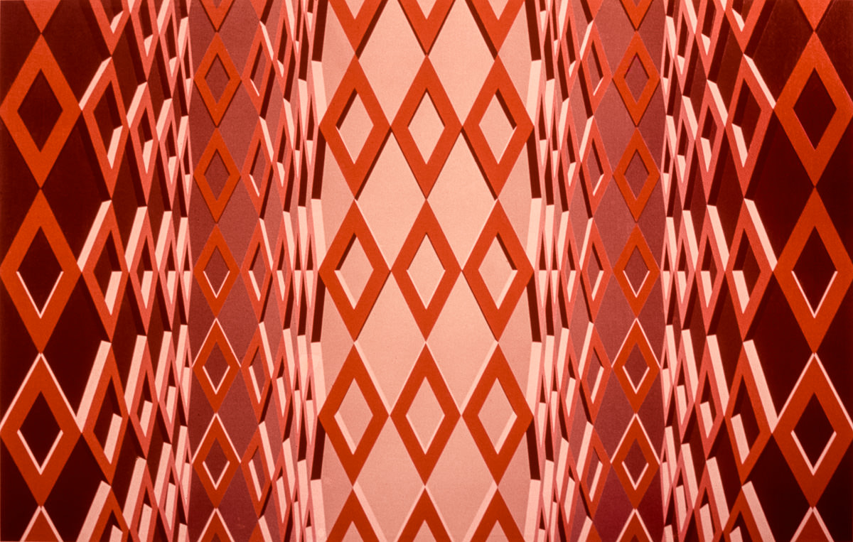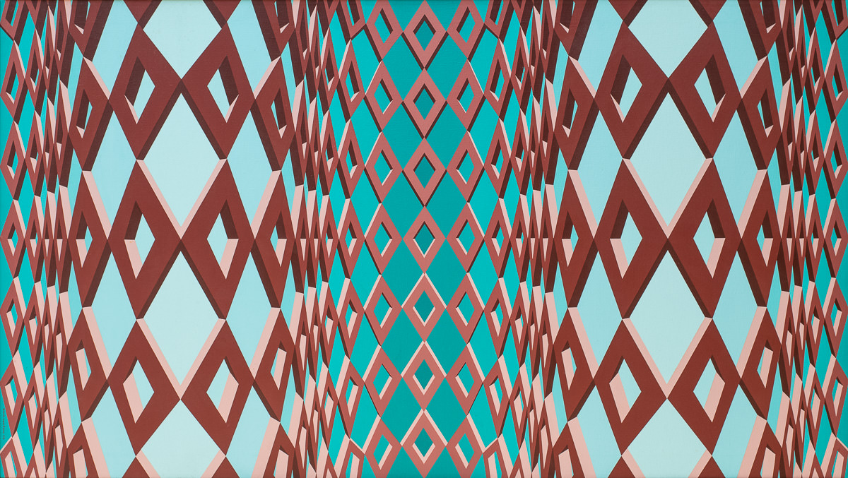 After months of experimentation, the Hard-Edge series below became my first legitimate series. To better provide an understanding of the progression of this early style, I've organized the paintings chronologically. As you will notice, the pieces turned more intricate with time. Many canvases were painted for this series and a good number sold. Regrettably, my only photographic record of the work sold, got damaged during my move to Brazil. I only realized this when gathering material for this website. Fortunately, I did manage to save two slides from those archives and added them to the group for more content. To avoid any confusion, they have been marked as sold.